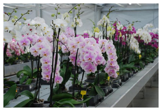 Het opkweken van stekje tot bloeiende orchidee, de verschillende fases. Phalaenopsis, vlinderorchidee. Deze orchideeën worden hier gekweekt. |