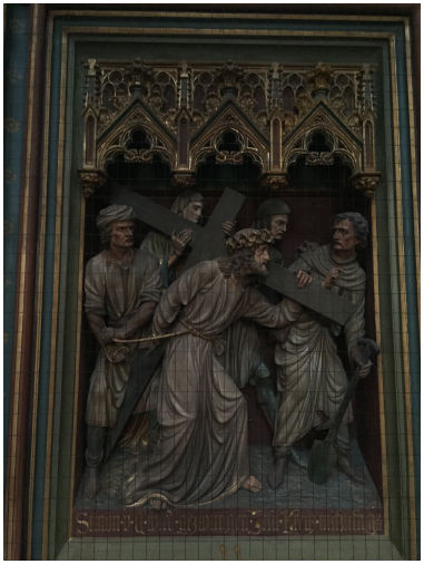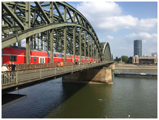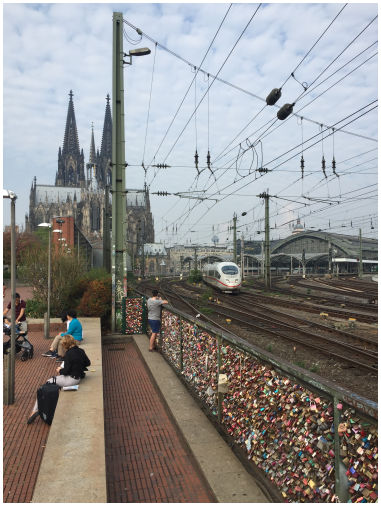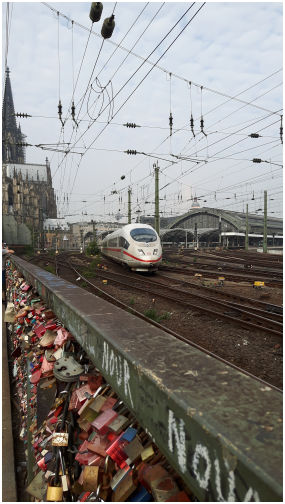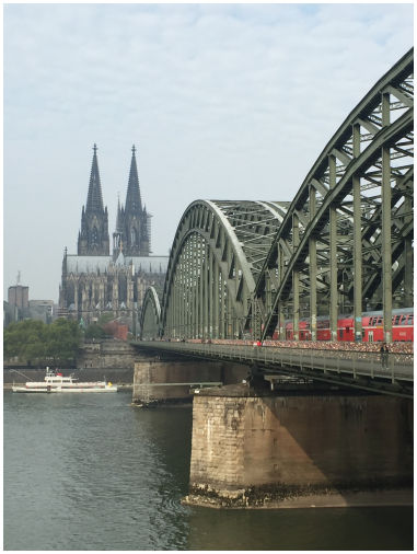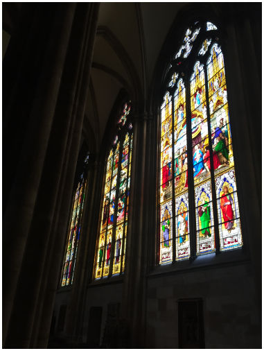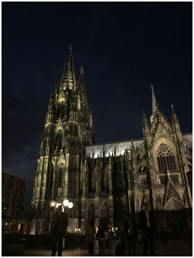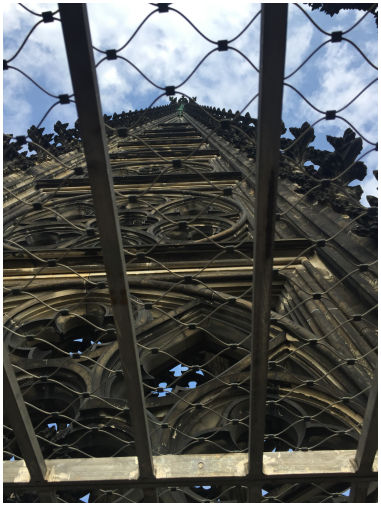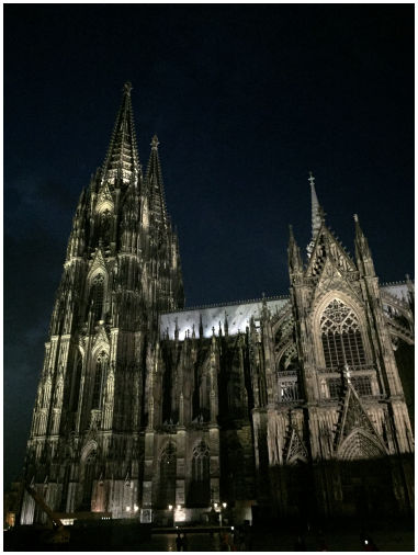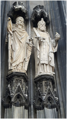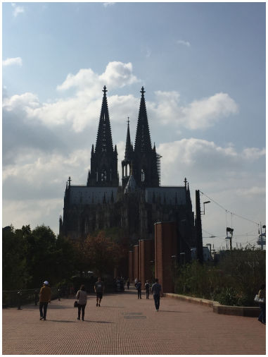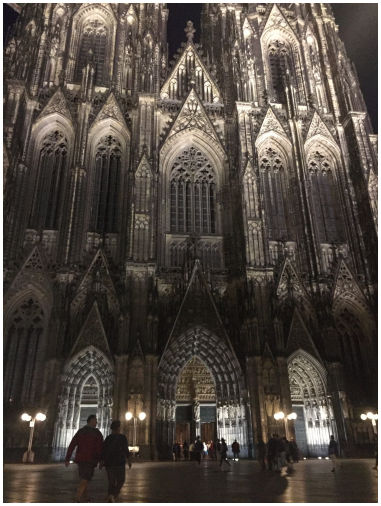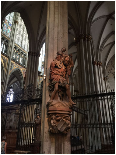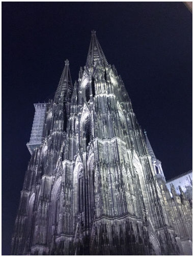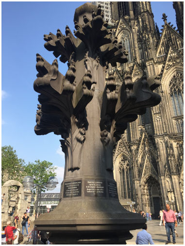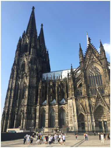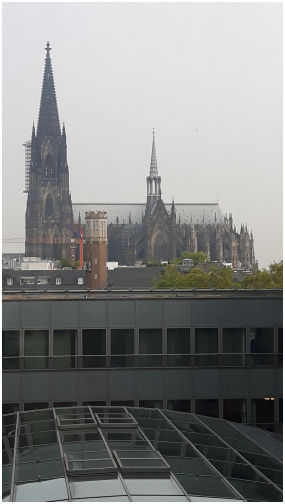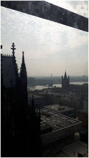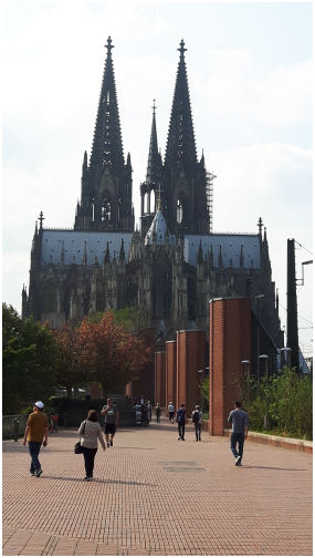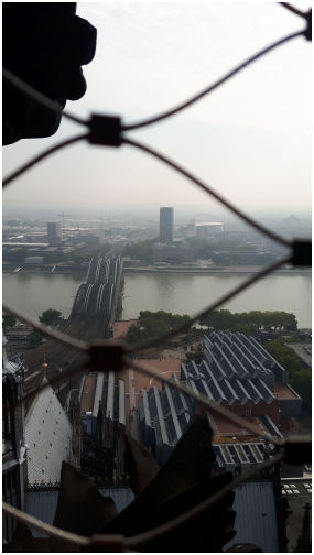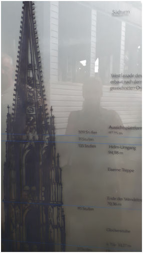 ![]() Vanaf de 157,38 meter hoge noordtoren en de 157,31 meter hoge zuidtoren (beide 509 treden) kan men de hele stad overzien. De dom is gebouwd in de vorm van een kruiskerk en is inclusief het schip en de torens 144,58 meter lang en 86,25 meter breed. Het gebouw heeft een bijzondere inventaris, waaronder enkele glas-in-loodramen die dateren uit de 14e en de 16e eeuw. Bron: https://nl.wikipedia.org/wiki/Dom_van_Keulen |