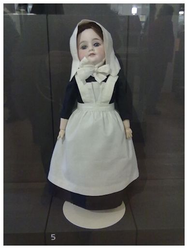 ![]() Pop in verpleegstersuniform van blauw katoen met witte schort en kap; hoofd beschilderd biscuit met glazen ogen, lijf papier-maché, bruine pruik. Fabrieksmerk Armand Marseille, Duitsland 1894. |