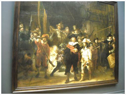 ![]() De nachtwacht is het bekendste schilderij van Rembrandt van Rijn. Hij schilderde het tussen 1639 en 1642. Het doek is 363 bij 437 cm groot. |