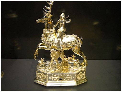 ![]() Tafelautomaat in de vorm van Diana op een hert. De kop kan eraf en het lijf kan gevuld worden met wijn. Degene bij wie het hert tot stilstand kwam mocht als eerste drinken. Gemaakt ca 1613/15 door Jacob Miller (1550-1618) |