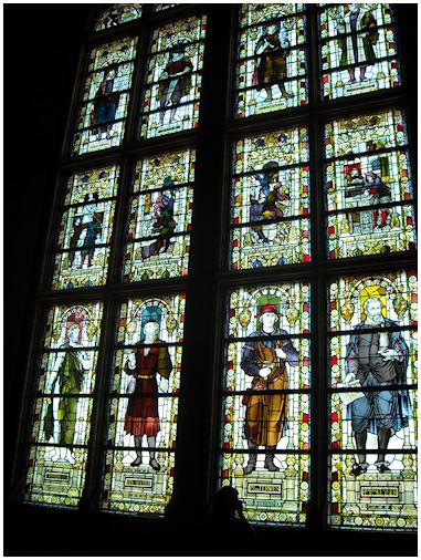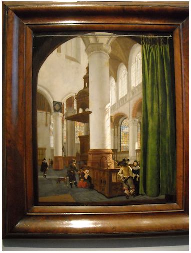![]() Interieur van de Oude kerk in Delft uit 1654 Een grapje is het groene gordijn, deze werden vroeger voor schilderijen gehangen tegen licht en stof. |